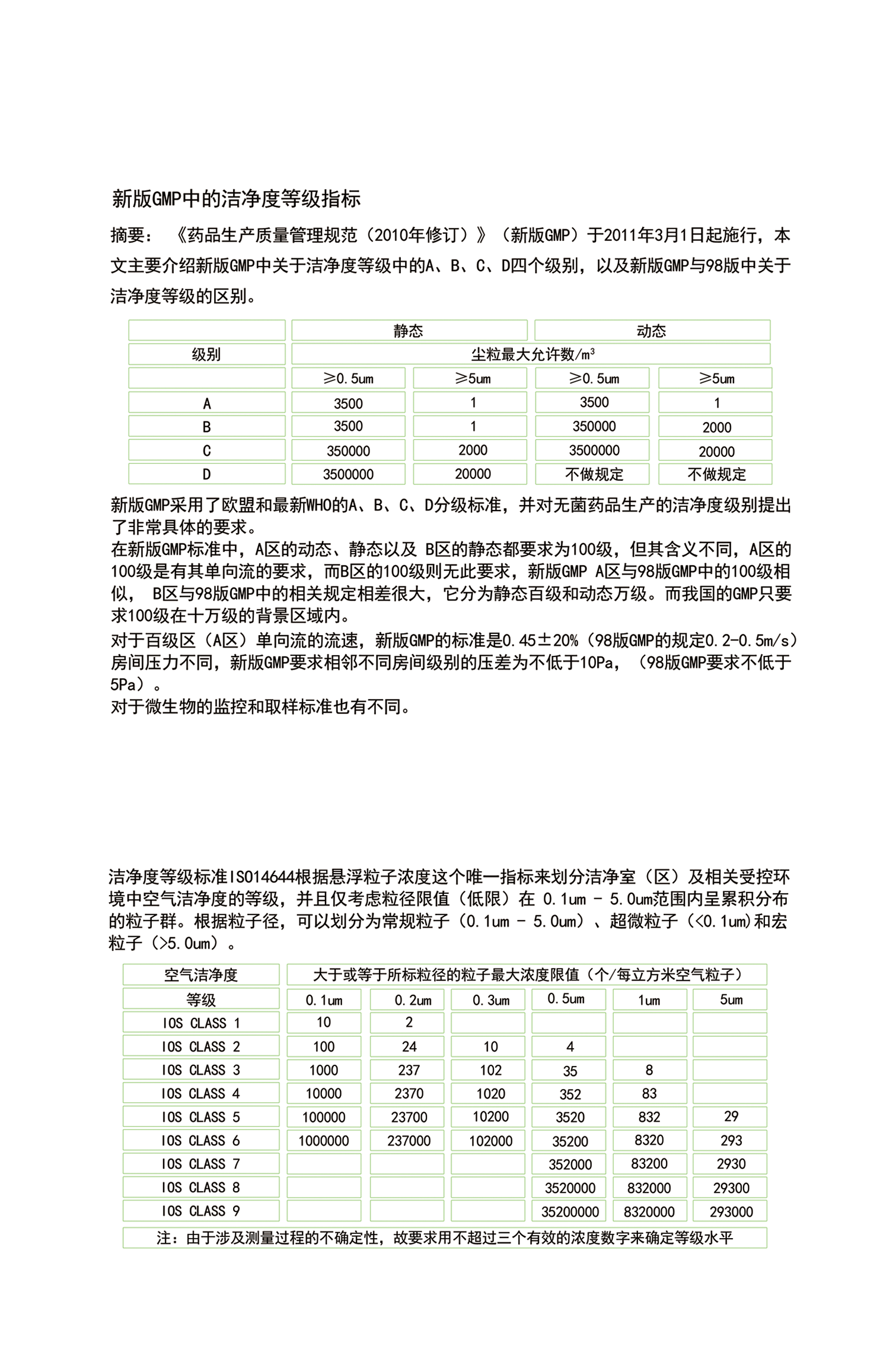 新版GMP潔凈度等級指標